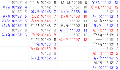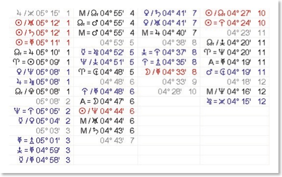 Das motivierte mich, die ganzen und halben Abstände von Faktoren in einem Horoskop zu systematisieren. Mit Hilfe des unranischen Spezial Programms haben wir jetzt die Möglichkeit, die Distanzen und Halbdistanzen nach Monaten geordnet für ein Jahr sofort abzurufen und zu deuten.