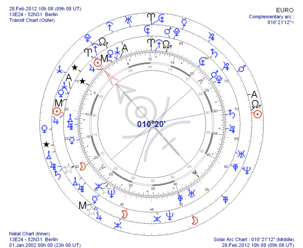 Es wird hier mit 3 Kreisen gearbeitet. Der innerste zeigt das Radix mit dem kleinen schwarzen Stern für LM Berlin und der große für LA Berlin. Im mittleren Kreis stehen die vorgeschobenen Planeten mit den Positionen für Italien von LM und LA Rom. Und im äußersten sehen wir die Transite für den 28.2.2012 für Griechenland mit den gleichen Sternen von LM und LA Athen. Alle Sterne werden in jedem der Kreise gedeutet. Weil sie optisch nicht anders ausgedrückt werden können, dürfte es bei der Handzeichnung einfach sein, alle Ortspunkte in jeden Kreis zu positionieren.